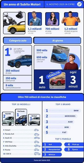 (Adnkronos) – Il 2025 è stato un anno molto importante per Subito, che ha raggiunto il traguardo dei 18 anni, confermandosi prima piattaforma di re-commerce in Italia. Subito mantiene la propria leadership nella second hand grazie a una community composta da 2,8 milioni di utenti unici giornalieri (in crescita dell’8,3% rispetto al 2024), 1,8 miliardi di visite (+5,1%) e 7 milioni di download dell’app. Ma, soprattutto, la piattaforma conferma il proprio Dna motori, che la contraddistingue dall’inizio della sua avventura, quando era ancora una start-up formata da un team di sole quattro persone. Subito Motori, infatti, si posiziona come punto di riferimento leader per ogni esigenza legata alla mobilità, e in particolare per chi cerca un’auto usata, come dimostrano i numeri: nel 2025, la sezione Motori ha visto quasi 1,3 miliardi di ricerche (con una crescita del 5% rispetto al 2024), 700 milioni di visite (+18%) e 1,2 milioni di utenti unici giornalieri (+25%). Anche nel 2025, la categoria Auto si conferma quella più visitata dagli utenti in piattaforma, con una crescita del 19,4% rispetto al 2024, grazie a una community davvero variegata, formata da 250.000 utenti privati e da 8.000 concessionari e rivenditori professionali, e grazie a oltre 500.000 annunci live ogni giorno, che rendono Subito Motori il parco auto più grande d’Italia. E anche il più vivace: grazie a Subito è stata venduta un’auto usata ogni 3 minuti. La categoria Auto ha visto nel 2025 oltre 700 milioni di ricerche (+ 3% rispetto al 2024), 350 milioni di visite (+16,7%) e oltre 650.000 utenti unici giornalieri (+24%). "Il Dna motori è da sempre radicato in Subito. La nostra categoria Auto rappresenta oggi uno dei canali più efficaci per mettere in connessione domanda e offerta, facilitando l’incontro tra chi desidera acquistare un’auto e chi intende venderla, siano essi privati o operatori professionali. Il nostro obiettivo è rispondere in modo puntuale alle esigenze di tutti gli utenti: che si tratti di una km0 o di un’auto storica, di una entry level o di un’auto premium, di rispondere a un bisogno o di realizzare un sogno, Subito Motori è il posto giusto per dare valore all’unicità di ogni veicolo usato", sottolinea Francesco Gaziano, Cheif Marketing Officer di Subito.  Non solo auto, Subito Motori rappresenta la mobilità a 360°, come dimostra la seconda categoria più visitata in piattaforma: Moto e Scooter, che segna un +12,6% rispetto al 2024, con 330.000 annunci live ogni giorno. Veicoli Commerciali è la categoria che cresce di più, con un aumento del 42,5%, piazzandosi al sesto posto tra quelle più visitate e confermando Subito Motori come partner ideale per i professionisti che hanno bisogno di mezzi di lavoro affidabili e convenienti. Altre due categorie in crescita, che incarnano gli ideali di passione e libertà nel mondo della mobilità, sono Nautica (+21%) e Caravan&Camper (+34%). Inoltre, Accessori Auto si conferma una categoria molto ricercata, al nono posto (in crescita del 4%), con il maggior numero assoluto di annunci live ogni giorno (1 milione), così come Bici, al decimo (+3%). Infine, molto particolare la situazione di Accessori Moto, che si piazza al tredicesimo posto tra le categorie più cercate (+7%), ma al quarto per numero di compravendite (+24,3%). Nel 2025, sulla base di 700 milioni di ricerche, le city car sono risultate le più cercate dagli automobilisti italiani, in linea con le classifiche di vendita: al primo posto guida la classifica l’intramontabile Panda, seguita dalla 500 e dalla tedesca Golf che chiude il podio. Novità interessante di quest’anno, Panda entra in classifica anche nella versione 4×4 (al 5° posto) e 500 nella versione X (al 10°). Non mancano tuttavia le auto premium, come Audi A3 (6° posto) e Alfa Giulietta (8°). Per quanto riguarda le ricerche per casa automobilistica, la trazione si conferma tutta tedesca. Ai primi tre posti tra i brand più cercati su Subito Motori troviamo BMW, seguita da Mercedes e Audi. Il mercato della second hand, infatti, rappresentare spesso il primo accesso a brand di fascia alta, offrendo la possibilità di guidare l’auto sognata. Guardando ai brand che crescono maggiormente, da segnalare il balzo di Toyota (6°posto), con il 30% di ricerche in più rispetto al 2024. Ma il brand che è cresciuto di più è Cupra, che segna addirittura un +43%. Infine, anche se fuori top500 e con numeri decisamente più piccoli, è possibile intercettare un trend emergente: la crescita dei brand cinesi come Jaecoo (+985%), Omoda (+469%) e Byd (+418%), che dimostrano come l’interesse degli italiani sia in forte crescita grazie probabilmente a prezzi competitivi e a una tecnologia che sta superando i pregiudizi