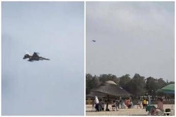 (Adnkronos) – In spiaggia a Dubai ombrelloni aperti e turisti in costume, in cielo scene di guerra. Un video condiviso sui social mostra un F-16E dell'aeronautica militare degli Emirati Arabi Uniti che piomba a bassa quota sulla spiaggia di Al Mamzar per abbattere un drone iraniano in avvicinamento. La scena è rapida, le persone in spiaggia restano dove sono ma alzano gli occhi al cielo per seguire ciò che sta accadendo.