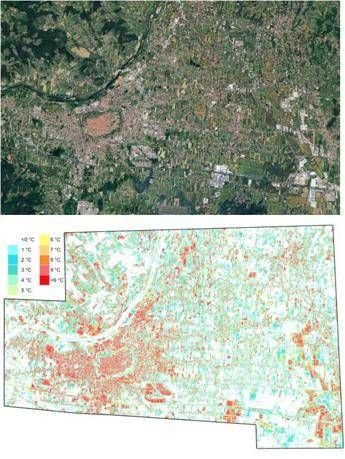 Mappa dell'intensità dell'isola di calore urbana calcolata come la differenza tra la temperatura di ogni punto e la temperatura media delle aree naturali, ricavata dall'immagine termica aerea ad alta risoluzione