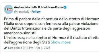 Se l'Italia vuole la riapertura dello stretto di Hormuz convinca Usa e Israele a porre fine alla guerra all'Iran. Questo in sintesi il messaggio indirizzato oggi, venerdì 3 aprile, da Teheran a Roma via social.  "Prima di parlare della riapertura dello stretto di Hormuz, l’Italia deve opporsi con fermezza alla palese violazione del diritto internazionale da parte degli aggressori americano-sionisti!", scrive in un post su X l'ambasciata iraniana a Roma, ribadendo che "l’insicurezza nello stretto di Hormuz è il risultato diretto dell’aggressione degli Stati Uniti e del regime sionista, non della legittima difesa dell’Iran". "Se siete preoccupati per la crisi globale dell’energia e dei fertilizzanti – esorta la rappresentanza di Teheran – costringete gli aggressori a porre fine completamente e definitivamente alla guerra, affinché la stabilità possa tornare nella regione".