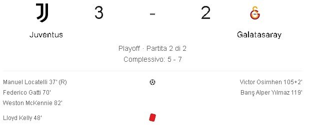 In dieci dal 49 minuti per l’espulsione di Kelly, i bianconeri hanno fatto paura al Galatasaray per tutto il secondo tempo riuscendo a fare due goal con un uomo in meno. La stanchezza è due grossi errori hanno però permesso ai turchi di segnare i due goal che li hanno portati agli ottavi. Nella competizione adesso rimane solo l’Atalanta. Venerdi ci saranno i sorteggi.
